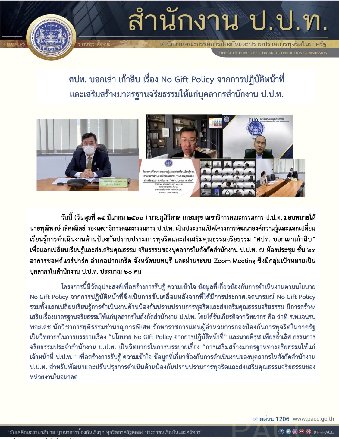 ศปท. บอกเล่า เก้าสิบ เรื่อง No Gift Policy จากการปฏิบัติหน้าที่และเสริมสร้างมาตรฐานจริยธรรมให้แก่บุคลากรสำนักงาน ป.ป.ท.
